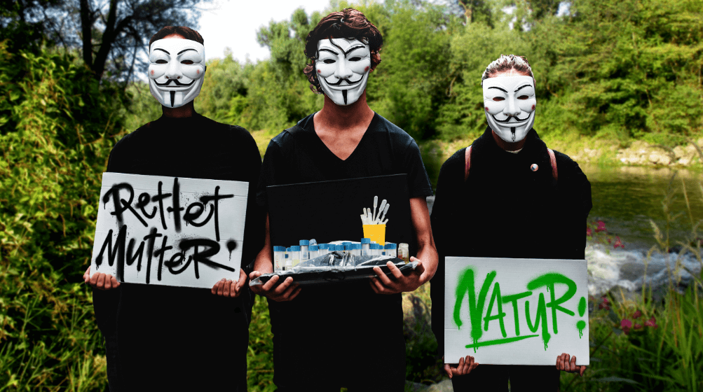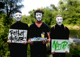 Wütend reckt das vermummte Trio seine Schilder mit der Aufschrift „Rettet Mutter Natur!“ in die Höhe, als unser Fotograf die Hensfelder Umweltaktivisten „Die drei Reiter“ ablichtet. Die drei möchten nicht erkannt werden und stellen sich mir maskiert als „Hypnos“, „Gaia“ und „Poseidon“ vor. Um ihre Anonymität zu wahren, treffen wir uns nicht bei ihnen zu Hause, sondern an einem Angelplatz am Fluss.